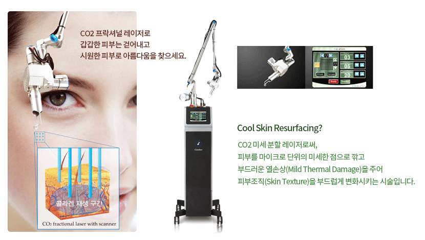 CO₂ 미세 분할 레이저로써, 피부를 마이크로 단위의 미세한 점으로 깍고 부드러운 열 손상(Mild Thermal Damage)을 주어 피부조직(Skin Texture)을 부드럽게 변화시키는 시술입니다.