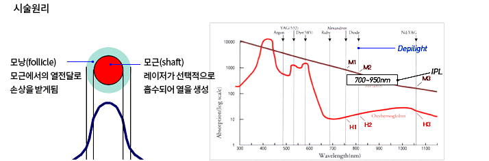 레이저 영구 제모의 원리는 멜라닌의 흡수도가 높은 레이저를 조사하여 모근(Shaft)에 선택적으로 흡수되게 하여 열을 생성하게 하고, 이 열이 모낭(Follicle)에 전달되어 손상을 받게 됩니다. 따라서, 레이저의 멜라닌 흡수도가 제모의 효과를 높이는데 가장 중요한 요소라고 볼 수 있는데 멜라닌의 흡수도가 너무 높을 경우, 표피 쪽에서 너무 많이 흡수되어 피부 속 깊이 있는 모낭에 전달되는데 어려움이 있고, 흡수도가 너무 낮을 경우, 높은 출력을 사용하여야 하므로 타 조직에 영향을 미칠 수 있어 통증 및 화상의 위험이 있습니다.